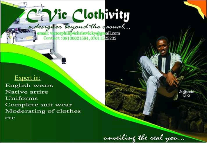 We deal in Cloth couture, sales, professional training, updated styling, and all that has to do with clothing.